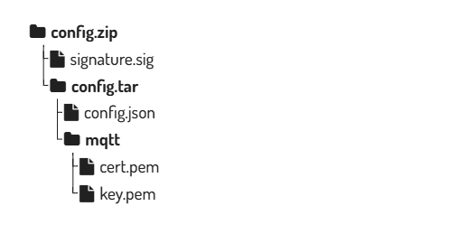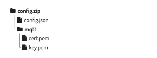 Example: If inside the configuration file the certificate ./mqtt/cert.pem and the key ./mqtt/key.pem are referenced, then the zip file should look like this: